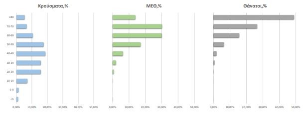 Ηλικιακή Κατανομή κρουσμάτων, νοσηλευόμενων στις MEΘ και ασθενών που απεβίωσαν από την αρχή της πανδημίας