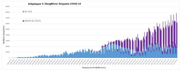 Από την 1η Ιανουαρίου 2020 μέχρι σήμερα, στα εργαστήρια που διενεργούν ελέγχους για τον νέο κορoνοϊό (SARS-CoV-2) και που δηλώνουν συστηματικά το σύνολο των δειγμάτων που ελέγχουν, έχουν συνολικά ελεγχθεί 4.532.854 κλινικά δείγματα ενώ από Μονάδες Υγείας και Κλιμάκια του ΕΟΔΥ που διενεργούν ελέγχους Rapid Ag έχουν ελεγχθεί 3.159.601 δείγματα. O μέσος όρος του επταημέρου είναι 54.029 δειγματοληπτικοί έλεγχοι.