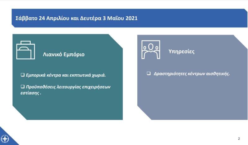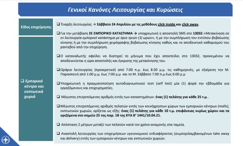 Επίσης, ανακοίνωσε πως από το Σάββατο 24 Απριλίου θα επαναλειτουργήσουν τα mall, εκπτωτικά χωριά και τα κέντρα αισθητικής, ενώ ανέφερε πως και στη Θεσσαλονίκη και την Κοζάνη επιτρέπεται πλέον η μέθοδος click in shop.