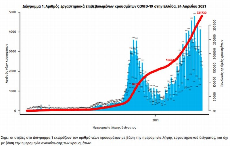 Συγκεκριμένα το Σάββατο (24.04), τα νέα εργαστηριακά επιβεβαιωμένα κρούσματα της νόσου που καταγράφηκαν τις τελευταίες 24 ώρες είναι 2.597, εκ των οποίων 6 εντοπίστηκαν κατόπιν ελέγχων στις πύλες εισόδου της χώρας. Ο συνολικός αριθμός των κρουσμάτων ανέρχεται σε 331.730 (ημερήσια μεταβολή +0.8%), εκ των οποίων 51.3% άνδρες. Με βάση τα επιβεβαιωμένα κρούσματα των τελευταίων 7 ημερών, 66 θεωρούνται σχετιζόμενα με ταξίδι από το εξωτερικό και 3.219 είναι σχετιζόμενα με ήδη γνωστό κρούσμα.