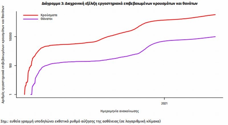 Η διαχρονική εξέλιξη των συνολικών κρουσμάτων και συνολικού αριθμού των θανάτων ασθενών COVID-19 παρουσιάζεται στο ακόλουθο