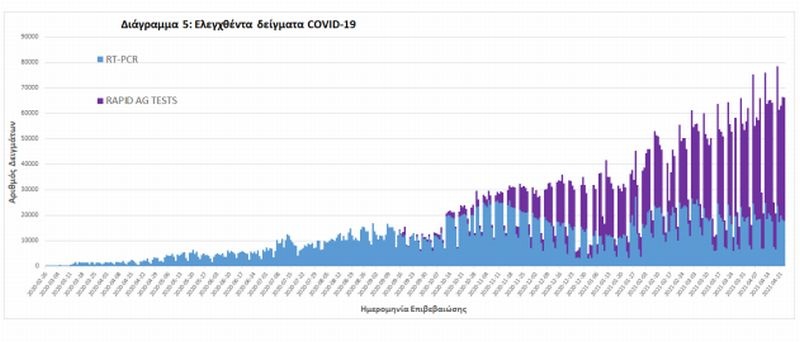 Από την 1η Ιανουαρίου 2020 μέχρι σήμερα, στα εργαστήρια που διενεργούν ελέγχους για τον νέο κορoνοϊό (SARS-CoV-2) και που δηλώνουν συστηματικά το σύνολο των δειγμάτων που ελέγχουν, έχουν συνολικά ελεγχθεί 4.569.062 κλινικά δείγματα ενώ από Μονάδες Υγείας και Κλιμάκια του ΕΟΔΥ που διενεργούν ελέγχους Rapid Ag έχουν ελεγχθεί 3.255.906 δείγματα. O μέσος όρος του επταημέρου είναι 54.476 δειγματοληπτικοί έλεγχοι ημερησίως.