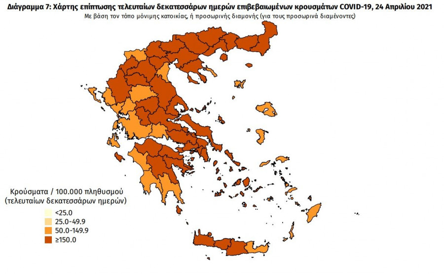 Πίνακας 2: Ημερήσιος αριθμός και κρούσματα ανά 100.000 πληθυσμού επιβεβαιωμένων εγχώριων κρουσμάτων COVID-19 ανά περιφερειακή ενότητα στις 24 Απριλίου 2021