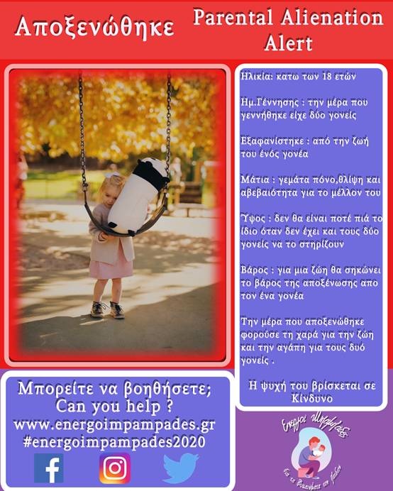 Το ανωτέρω κείμενο πρόκειται για αληθινή ιστορία όπως μας την έστειλε ένας αποξενωμένος Πατέρας που βλέπει το παιδί του περίπου 1 φορά τον μήνα για 3 ώρες, ανάλογα την επιθυμία του γονέα που έχει την αποκλειστική επιμέλεια. Τα προσωπικά στοιχεία ενδέχεται να έχουν παραποιηθεί για λόγους σεβασμού της ανωνυμίας και απορρήτου δεδομένων.