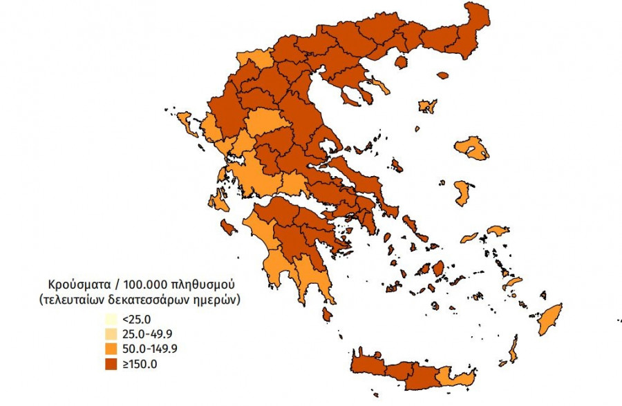 Γεωγραφική διασπορά: Ο χάρτης αποτυπώνει τη γεωγραφική κατανομή των συνολικών κρουσμάτων COVID-19 (από την αρχή της επιδημίας) ανά Περιφερειακή Ενότητα της χώρας, με βάση την δηλωθείσα διεύθυνση μόνιμης κατοικίας του ασθενούς, ή τη διεύθυνση προσωρινής διαμονής για τους τουρίστες και άλλους προσωρινά διαμένοντες στην Ελλάδα. Συμπεριλαμβάνονται τόσο κρούσματα με ιστορικό ταξιδίου (“εισαγόμενα”) όσο και κρούσματα με πιθανή εγχώρια μετάδοση.