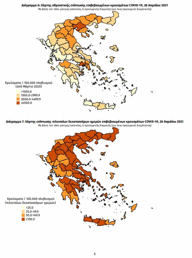 Ημερήσιος αριθμός και κρούσματα ανά 100.000 πληθυσμού επιβεβαιωμένων εγχώριων κρουσμάτων COVID-19 ανά περιφερειακή ενότητα στις 26 Απριλίου 2021.