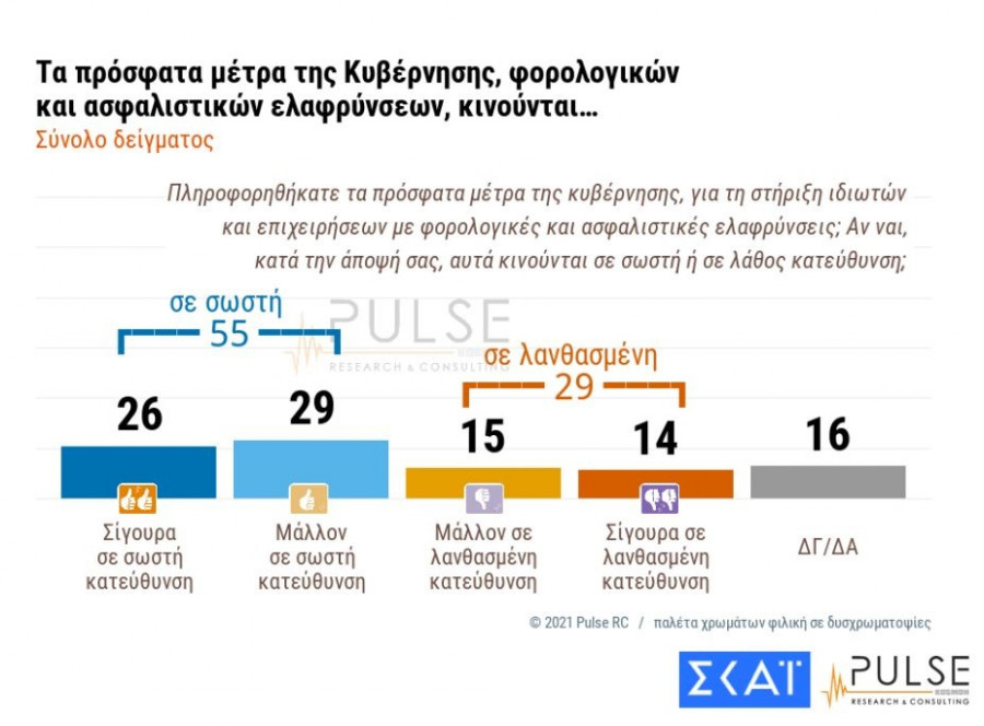 Σχετικά με τις φορολογικές και ασφαλιστικές ελαφρύνσεις της κυβέρνησης για τη στήριξη ιδιωτών και επιχειρήσεων, το 55% τις υποδέχεται θετικά (26% σίγουρα σε θετική κατεύθυνση, 29% μάλλον σε θετική κατεύθυνση), ενώ το 29% τις κρίνει αρνητικά (15% μάλλον σε λανθασμένη κατεύθυνση, 14% σίγουρα σε λανθασμένη κατεύθυνση). Ένα ποσοστό 16% απάντησε «δεν γνωρίζω/δεν απαντώ».