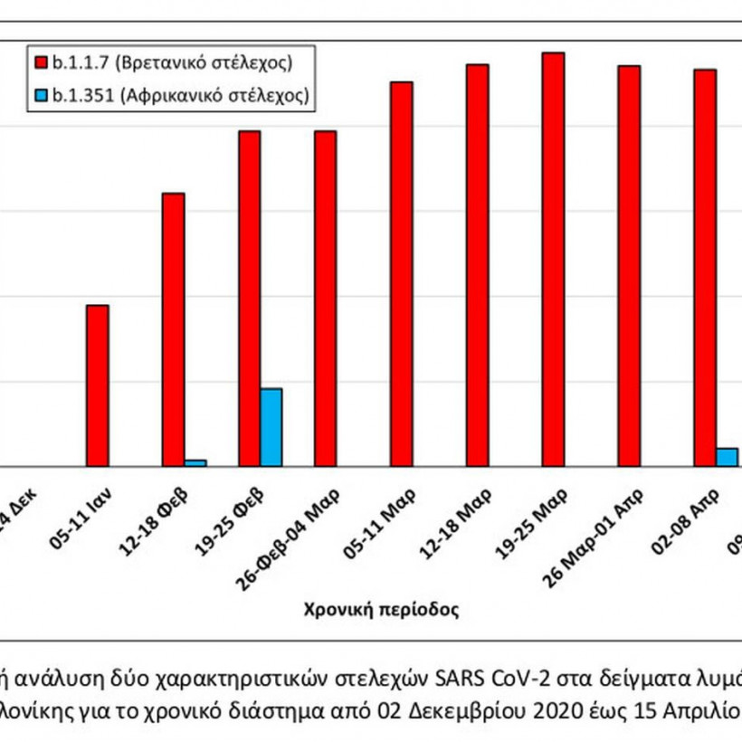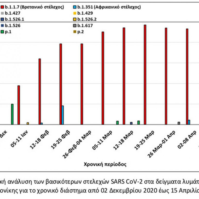 Όπως φαίνεται στα διαγράμματα που παρουσιάζει το ΑΠΕ-ΜΠΕ, το διάστημα από 19 έως 25 Μαρτίου η επικράτηση του βρετανικού -πολύ πιο μεταδοτικού στελέχους του ιού- αγγίζει το 100%, έχοντας κυριαρχήσει απόλυτα έναντι άλλων ευρέως διαδεδομένων στην παγκόσμια κοινότητα μεταλλάξεων, όπως η νοτιοαφρικανική, η οποία μόνο το διάστημα 19-25 Φεβρουαρίου πλησιάζει στο 20% κι επανεμφανίζεται το διάστημα 2-8 Απριλίου σε ποσοστό μικρότερο του 5%. Οι τελευταίες μετρήσεις, μέσω της ανάλυσης των γονιδιωμάτων του ιού στα λύματα, αφορούν την εβδομάδα 9-15 Απριλίου και δείχνουν επικράτηση του βρετανικού στελέχους σε ποσοστό που αγγίζει και πάλι το 100%.