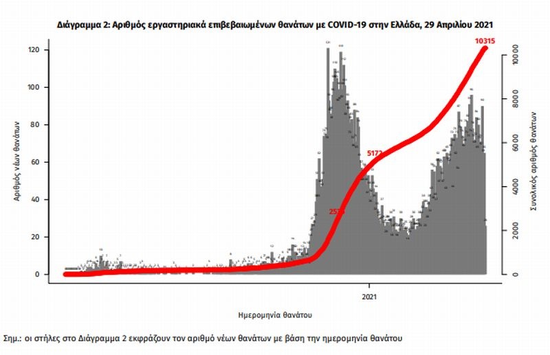 Οι νέοι θάνατοι ασθενών με COVID-19 είναι 73, ενώ από την έναρξη της επιδημίας έχουν καταγραφεί συνολικά 10.315 θάνατοι. Το 95.4% είχε υποκείμενο νόσημα ή/και ηλικία 70 ετών και άνω.