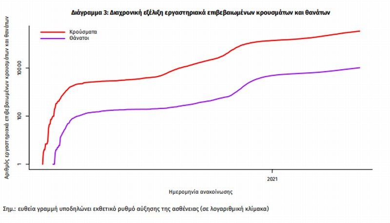 Η διαχρονική εξέλιξη των συνολικών κρουσμάτων και συνολικού αριθμού των θανάτων ασθενών COVID-19 παρουσιάζεται στο ακόλουθο