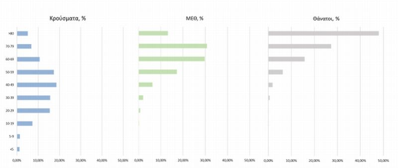 Ηλικιακή Κατανομή κρουσμάτων, νοσηλευόμενων στις MEΘ και ασθενών που απεβίωσαν από την αρχή της πανδημίας