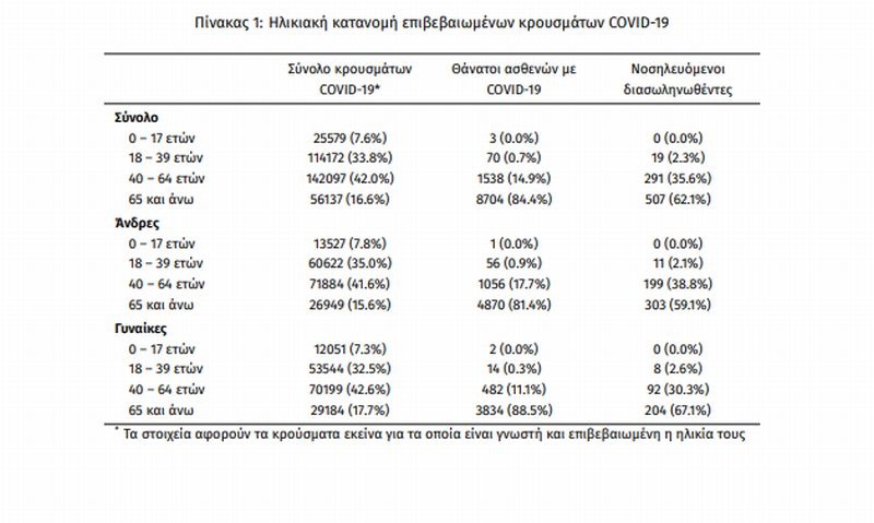 Ο αριθμός των ασθενών που νοσηλεύονται διασωληνωμένοι είναι 817 (62.9% άνδρες). Η διάμεση ηλικία τους είναι 68 έτη. To 85.6% έχει υποκείμενο νόσημα ή/και ηλικία 70 ετών και άνω. Από την αρχή της πανδημίας έχουν εξέλθει από τις ΜΕΘ 2.104 ασθενείς. Οι εισαγωγές νέων ασθενών Covid-19 στα νοσοκομεία της επικράτειας είναι 484 (ημερήσια μεταβολή -8.68%). Ο μέσος όρος εισαγωγών του επταημέρου είναι 463 ασθενείς.Η διάμεση ηλικία των κρουσμάτων είναι 44 έτη (εύρος 0.2 έως 106 έτη), ενώ η διάμεση ηλικία των θανόντων είναι 78 έτη (εύρος 0.2 έως 106 έτη).