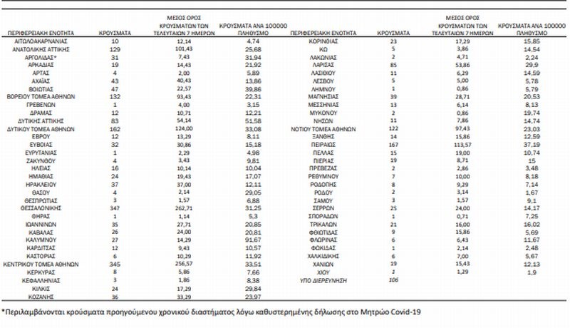 Από το σύνολο των 2.435 νέων κρουσμάτων του νέου ιού στη χώρα 8 είναι εισαγόμενα εκ των οποίων 5 εντοπίστηκαν κατόπιν ελέγχων στις πύλες εισόδου της χώρας. Η κατανομή των 2.427 νέων εγχώριων κρουσμάτων ανά Περιφερειακή Ενότητα παρουσιάζεται στον κατωτέρω πίνακα.