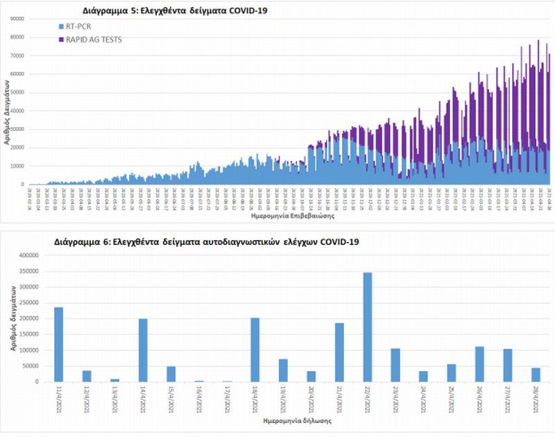 Από την 1η Ιανουαρίου 2020 μέχρι σήμερα, στα εργαστήρια που διενεργούν ελέγχους για τον νέο κορονοϊό (SARS-CoV-2) και που δηλώνουν συστηματικά το σύνολο των δειγμάτων που ελέγχουν, έχουν συνολικά ελεγχθεί 4.645.215 κλινικά δείγματα ενώ από Μονάδες Υγείας και Κλιμάκια του ΕΟΔΥ που διενεργούν ελέγχους Rapid Ag έχουν ελεγχθεί 3.434.476 δείγματα. O μέσος όρος του επταημέρου είναι 55.319 δειγματοληπτικοί έλεγχοι.