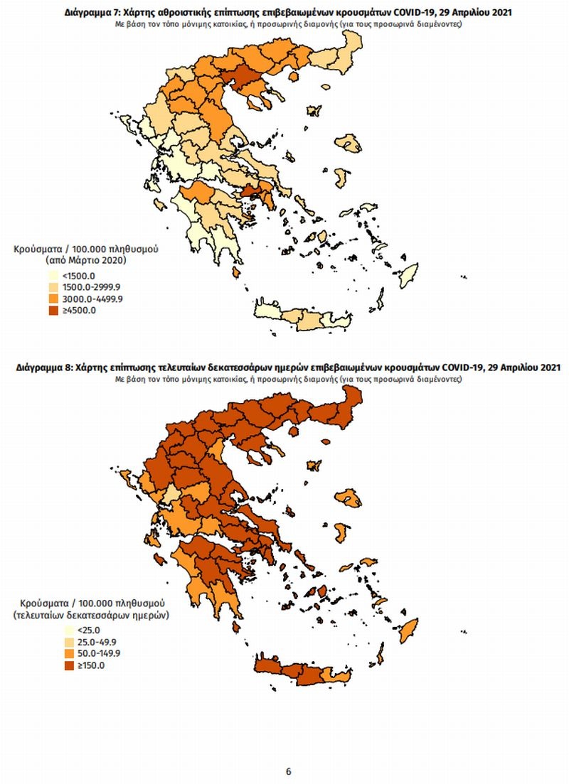 Ημερήσιος αριθμός και κρούσματα ανά 100.000 πληθυσμού επιβεβαιωμένων εγχώριων κρουσμάτων COVID-19 ανά περιφερειακή ενότητα στις 29 Απριλίου 2021: