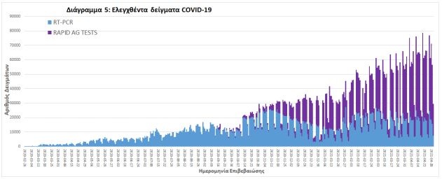 Από την 1η Ιανουαρίου 2020 μέχρι σήμερα, στα εργαστήρια που διενεργούν ελέγχους για τον νέο κορoνοϊό (SARS-CoV-2) και που δηλώνουν συστηματικά το σύνολο των δειγμάτων που ελέγχουν, έχουν συνολικά ελεγχθεί 4.668.275 κλινικά δείγματα ενώ από Μονάδες Υγείας και Κλιμάκια του ΕΟΔΥ που διενεργούν ελέγχους Rapid Ag έχουν ελεγχθεί 3.497.337 δείγματα.