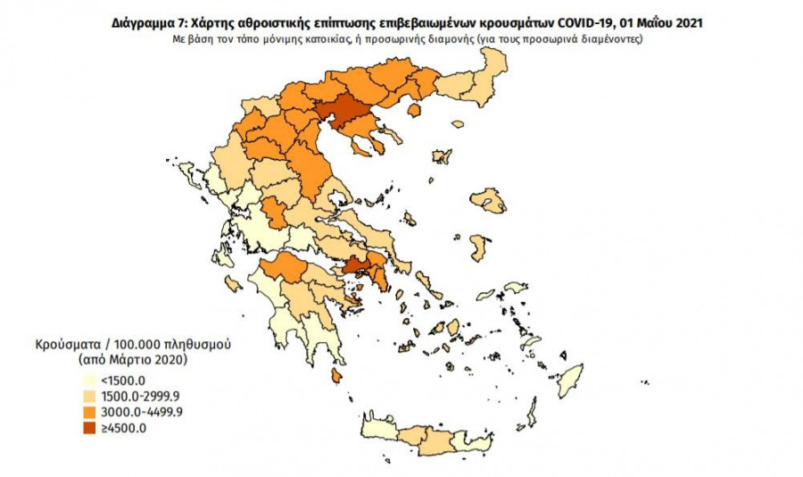 Ο χάρτης αποτυπώνει τη γεωγραφική κατανομή των συνολικών κρουσμάτων COVID-19 (από την αρχή της επιδημίας) ανά Περιφερειακή Ενότητα της χώρας, με βάση την δηλωθείσα διεύθυνση μόνιμης κατοικίας του ασθενούς, ή τη διεύθυνση προσωρινής διαμονής για τους τουρίστες και άλλους προσωρινά διαμένοντες στην Ελλάδα. Συμπεριλαμβάνονται τόσο κρούσματα με ιστορικό ταξιδίου (“εισαγόμενα”)