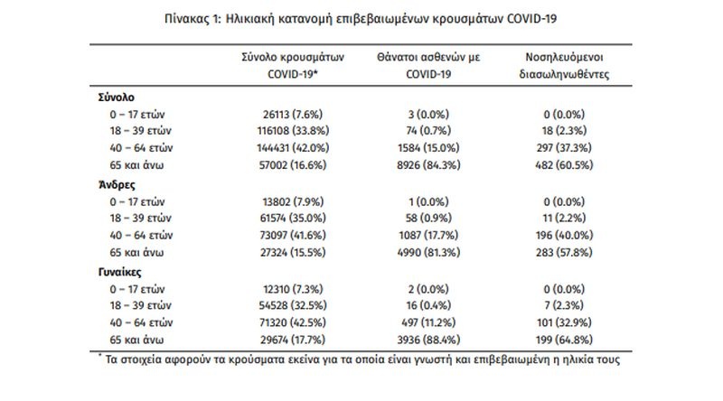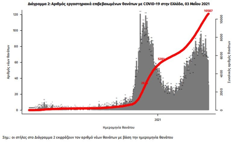 Οι νέοι θάνατοι ασθενών με COVID-19 που καταγράφηκαν τις τελευταίες 48 ώρες είναι 134, ενώ από την έναρξη της επιδημίας έχουν καταγραφεί συνολικά 10.587 θάνατοι. Το 95.4% είχε υποκείμενο νόσημα ή/και ηλικία 70 ετών και άνω.