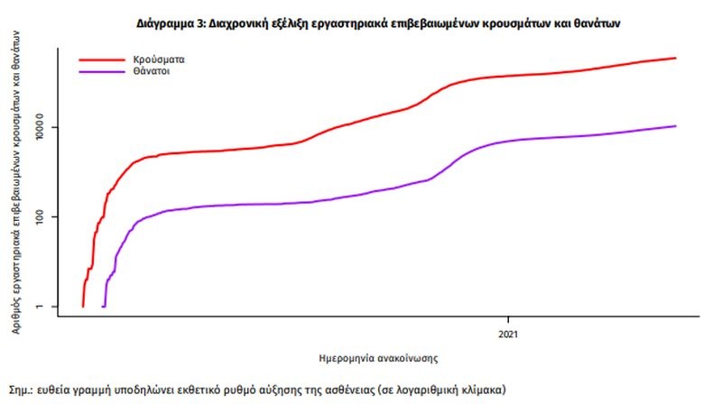 Η διαχρονική εξέλιξη των συνολικών κρουσμάτων και συνολικού αριθμού των θανάτων ασθενών COVID-19 παρουσιάζεται στο ακόλουθο διάγραμμα.