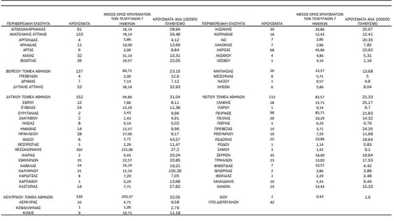 Από το σύνολο των 2.146 νέων κρουσμάτων του νέου ιού στη χώρα 11 είναι εισαγόμενα εκ των οποίων 9 εντοπίστηκαν κατόπιν ελέγχων στις πύλες εισόδου της χώρας. Η κατανομή των 2.135 νέων εγχώριων κρουσμάτων ανά Περιφερειακή Ενότητα παρουσιάζεται στον κατωτέρω πίνακα.