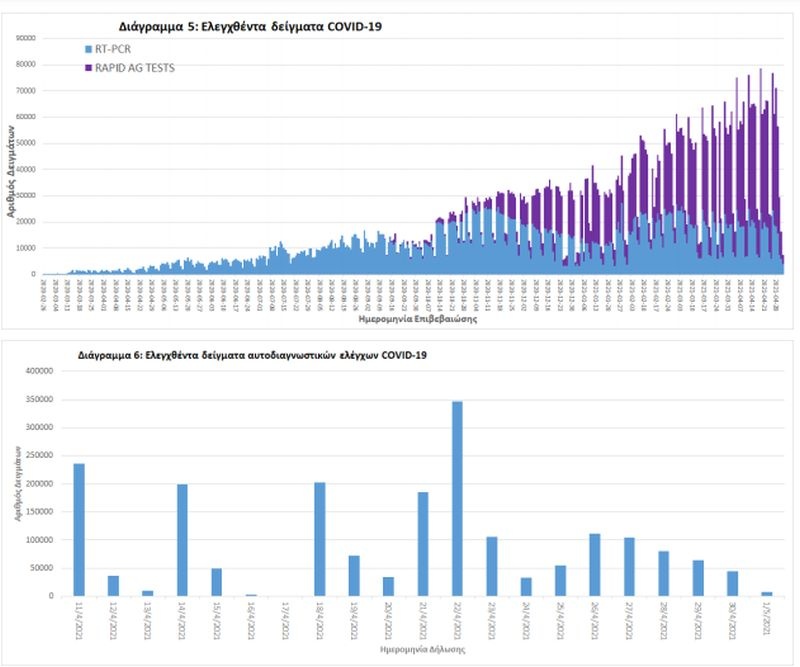 Από την 1η Ιανουαρίου 2020 μέχρι σήμερα, στα εργαστήρια που διενεργούν ελέγχους για τον νέο κορoνοϊό (SARS-CoV-2) και που δηλώνουν συστηματικά το σύνολο των δειγμάτων που ελέγχουν, έχουν συνολικά ελεγχθεί 4.678.223 κλινικά δείγματα ενώ από Μονάδες Υγείας και Κλιμάκια του ΕΟΔΥ που διενεργούν ελέγχους Rapid Ag έχουν ελεγχθεί 3.511.226 δείγματα. O μέσος όρος του επταημέρου είναι 45.572 δειγματοληπτικοί έλεγχοι.