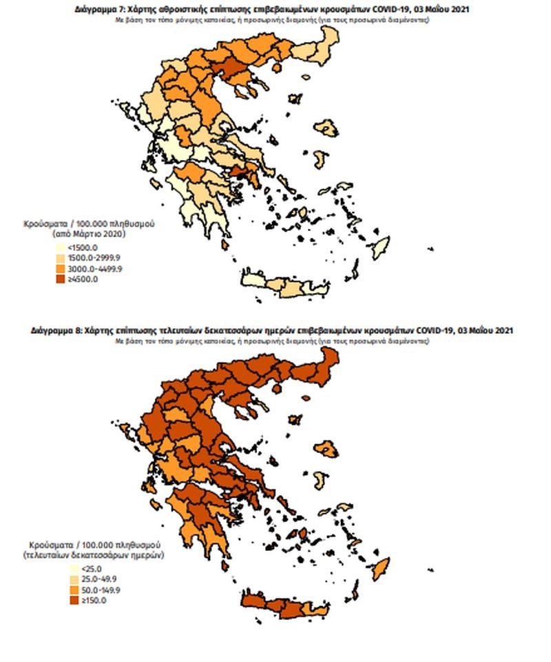 Ημερήσιος αριθμός και κρούσματα ανά 100.000 πληθυσμού επιβεβαιωμένων εγχώριων κρουσμάτων COVID-19 ανά περιφερειακή ενότητα στις 03 Μαΐου 2021
