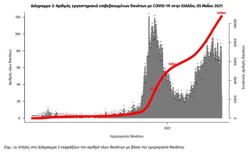 Οι νέοι θάνατοι ασθενών με COVID-19 είναι 96, ενώ από την έναρξη της επιδημίας έχουν καταγραφεί συνολικά 10.764 θάνατοι. Το 95.3% είχε υποκείμενο νόσημα ή/και ηλικία 70 ετών και άνω.