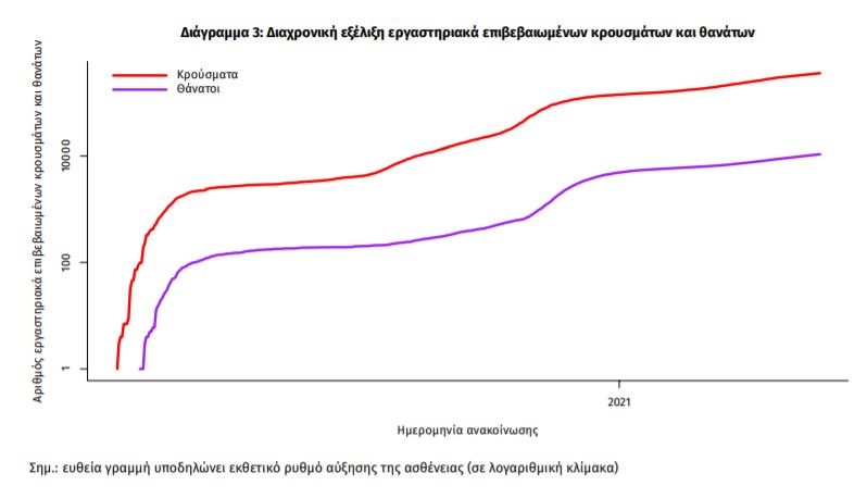 Η διαχρονική εξέλιξη των συνολικών κρουσμάτων και συνολικού αριθμού των θανάτων ασθενών COVID-19 παρουσιάζεται στο ακόλουθο διάγραμμα.