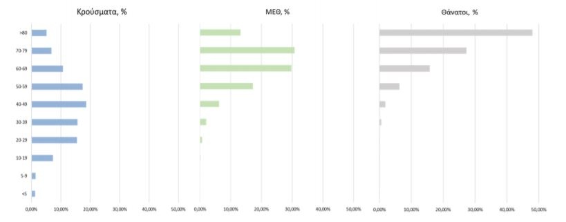 Διάγραμμα 4: Ηλικιακή Κατανομή κρουσμάτων, νοσηλευόμενων στις MEΘ και ασθενών που απεβίωσαν από την αρχή της πανδημίας.