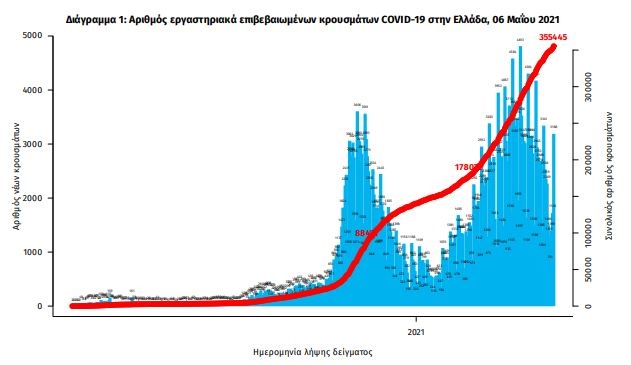 Κορονοϊός - Όλες οι ειδήσεις: Την Πέμπτη, 6 Μαΐου 2021, ο ΕΟΔΥ ανακοίνωσε, 3.421 νέα κρούσματα του νέου ιού στη χώρα, εκ των οποίων τα εννέα εντοπίστηκαν κατόπιν ελέγχων στις πύλες εισόδου της χώρας.