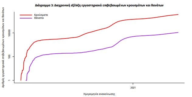 Η διαχρονική εξέλιξη των συνολικών κρουσμάτων και συνολικού αριθμού των θανάτων ασθενών COVID-19 παρουσιάζεται στο ακόλουθο διάγραμμα.