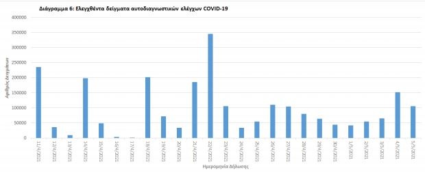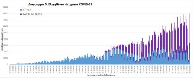 Από την 1η Ιανουαρίου 2020 μέχρι σήμερα, στα εργαστήρια που διενεργούν ελέγχους για τον νέο κορoνοϊό (SARS-CoV-2) και που δηλώνουν συστηματικά το σύνολο των δειγμάτων που ελέγχουν, έχουν συνολικά ελεγχθεί 4.718.204 κλινικά δείγματα ενώ από Μονάδες Υγείας και Κλιμάκια του ΕΟΔΥ που διενεργούν ελέγχους Rapid Ag έχουν ελεγχθεί 3.606.731 δείγματα.