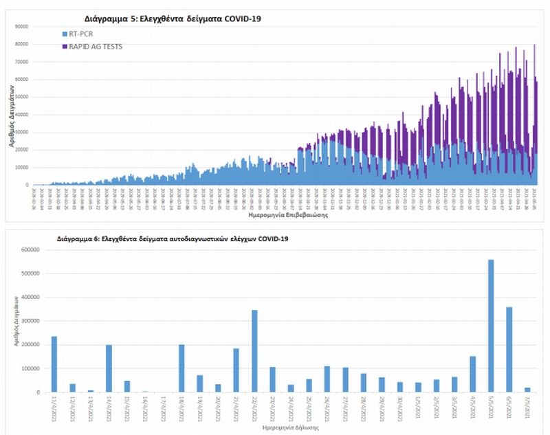 Από την 1η Ιανουαρίου 2020 μέχρι σήμερα, στα εργαστήρια που διενεργούν ελέγχους για τον νέο κορονοϊό (SARS-CoV-2) και που δηλώνουν συστηματικά το σύνολο των δειγμάτων που ελέγχουν, έχουν συνολικά ελεγχθεί 4.753.945 κλινικά δείγματα ενώ από Μονάδες Υγείας και Κλιμάκια του ΕΟΔΥ που διενεργούν ελέγχους Rapid Ag έχουν ελεγχθεί 3.691.744 δείγματα. O μέσος όρος του επταημέρου είναι 40.011 δειγματοληπτικοί έλεγχοι.