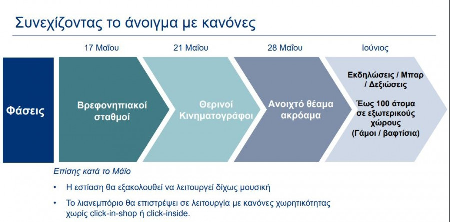 Για λίγο αργότερα μετατίθεται η επαναλειτουργία των βρεφονηπιακών σταθμών (17/5), των θερινών κινηματογράφων (21/5), των ανοιχτών πολιτιστικών χώρων (28/5).