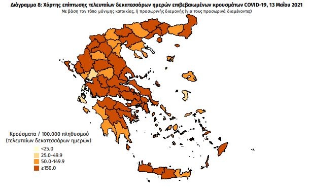 Πίνακας 2: Ημερήσιος αριθμός και κρούσματα ανά 100.000 πληθυσμού επιβεβαιωμένων εγχώριων κρουσμάτων COVID-19 ανά περιφερειακή ενότητα στις 13 Μαΐου 2021.