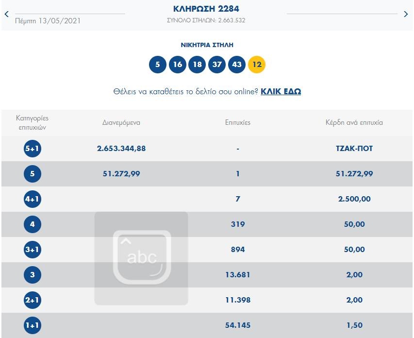 Οι τυχεροί αριθμοί που έβγαλε η κληρωτίδα της αποψινής κλήρωσης είναι οι: 5, 16, 18, 37, 43 και τζόκερ ο αριθμός 12.
