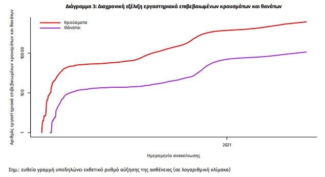 Η διαχρονική εξέλιξη των συνολικών κρουσμάτων και συνολικού αριθμού των θανάτων ασθενών COVID-19 παρουσιάζεται στο ακόλουθο διάγραμμα.