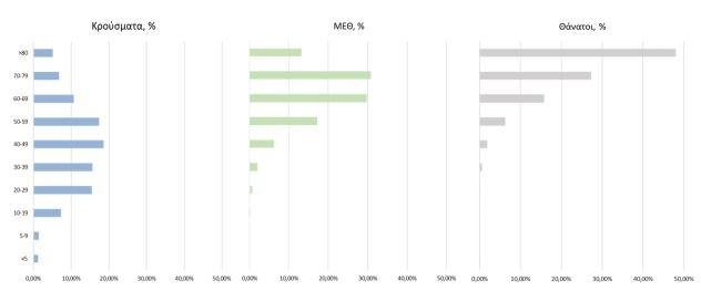 Διάγραμμα 4: Ηλικιακή Κατανομή κρουσμάτων, νοσηλευόμενων στις MEΘ και ασθενών που απεβίωσαν από την αρχή της πανδημίας.