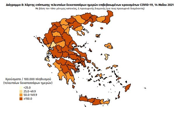 Πίνακας 2: Ημερήσιος αριθμός και κρούσματα ανά 100.000 πληθυσμού επιβεβαιωμένων εγχώριων κρουσμάτων COVID-19 ανά περιφερειακή ενότητα στις 14 Μαΐου 2021.