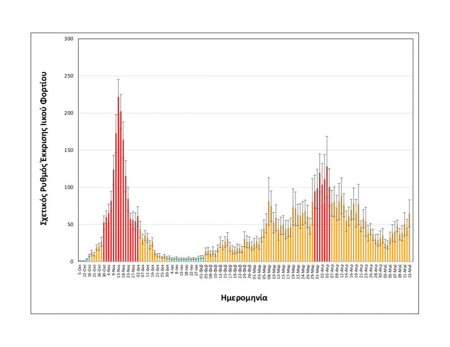 Το ιικό φορτίο των λυμάτων, όπως φαίνεται στα διαγράμματα που παρουσιάζει το ΑΠΕ-ΜΠΕ, στην τελευταία μέτρηση έχει ανέλθει στο επίπεδο που μετρούταν στις 19 Απριλίου.