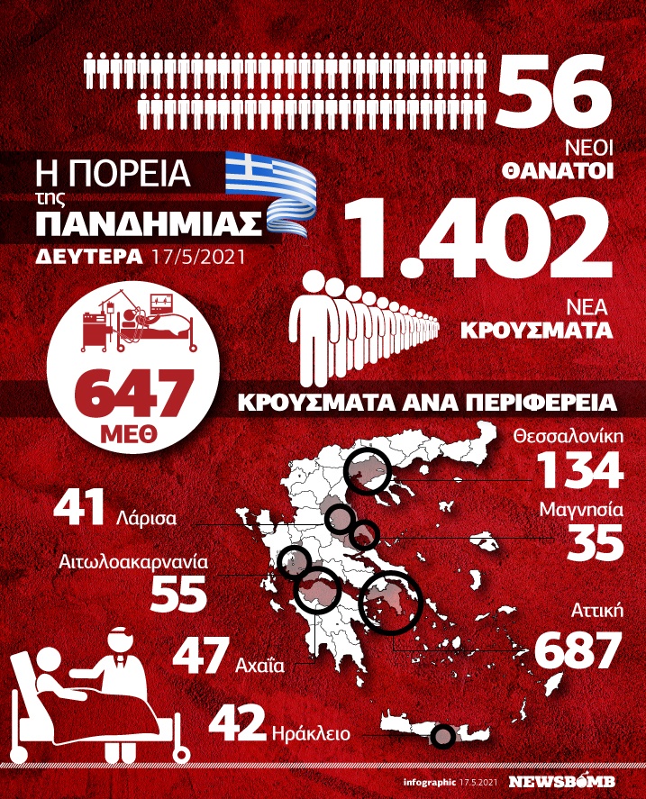 Κρούσματα σήμερα: 1.402 νέα ανακοίνωσε ο ΕΟΔΥ - 56 θάνατοι σε 24 ώρες, στους 647 οι διασωληνωμένοι