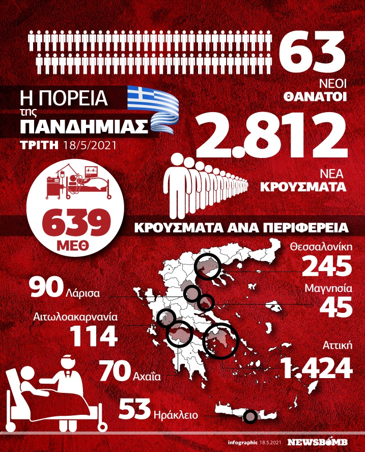 Οι νέοι θάνατοι ασθενών με COVID-19 είναι 63 ενώ ο αριθμός των ασθενών που νοσηλεύονται διασωληνωμένοι είναι 639.
