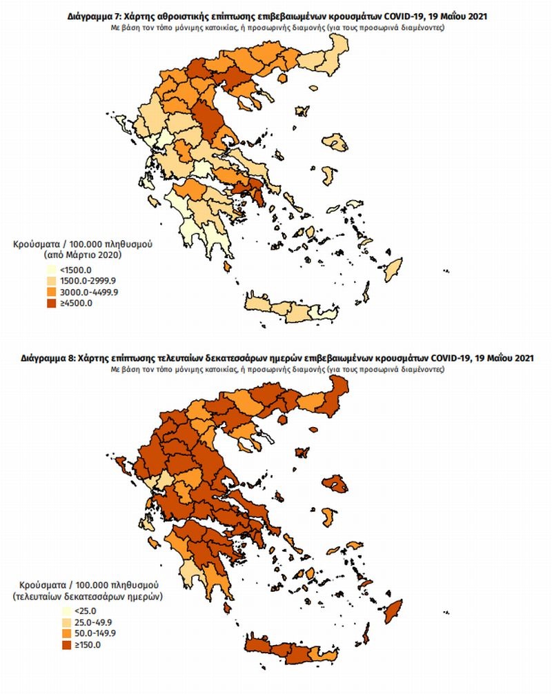 Ημερήσιος αριθμός και κρούσματα ανά 100.000 πληθυσμού επιβεβαιωμένων εγχώριων κρουσμάτων COVID-19 ανά περιφερειακή ενότητα στις 19 Μαΐου 2021.
