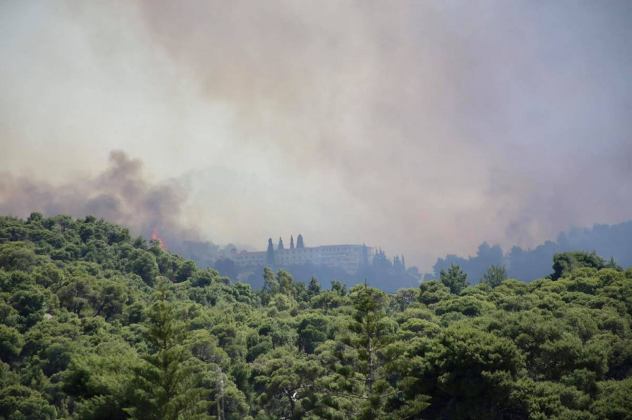 Η φωτιά όπως φαίνεται και από τις εικόνες του Newsbomb.gr πλησιάζει επικίνδυνα σε μοναστήρι της περιοχής το οποίο φαίνεται ότι έχει περικυκλωθεί από τους καπνούς.