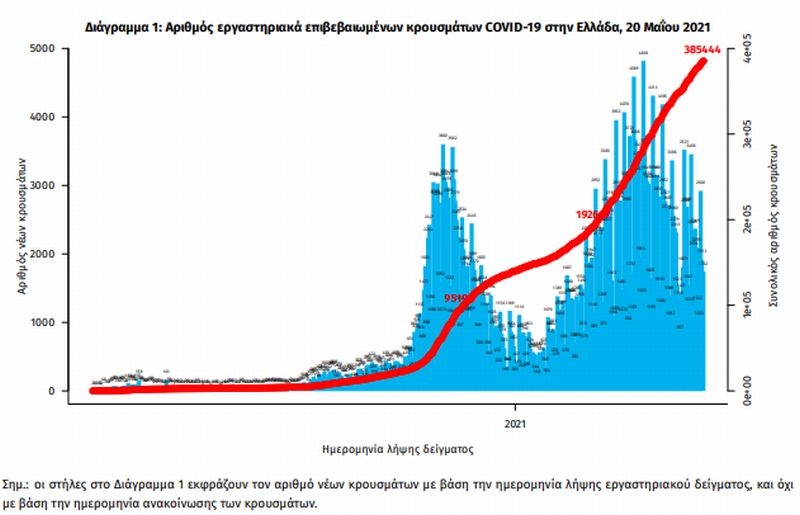 Η διαχρονική εξέλιξη των συνολικών κρουσμάτων και συνολικού αριθμού των θανάτων ασθενών COVID-19 παρουσιάζεται στο ακόλουθο διάγραμμα.
