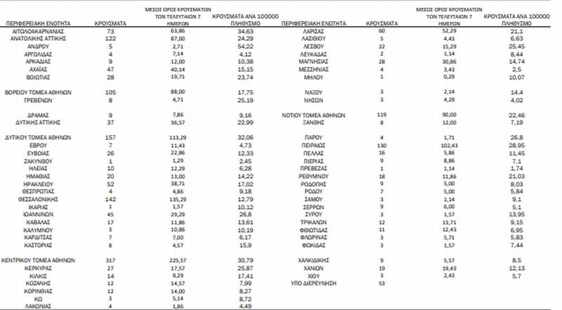 Με βάση τα επιβεβαιωμένα κρούσματα των τελευταίων 7 ημερών, 28 θεωρούνται σχετιζόμενα με ταξίδι από το εξωτερικό και 2.157 είναι σχετιζόμενα με ήδη γνωστό κρούσμα.