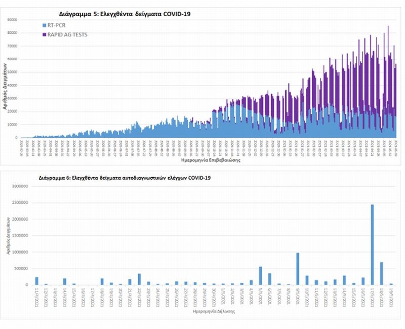 Από την 1η Ιανουαρίου 2020 μέχρι σήμερα, στα εργαστήρια που διενεργούν ελέγχους για τον νέο κορονοϊό (SARS-CoV-2) και που δηλώνουν συστηματικά το σύνολο των δειγμάτων που ελέγχουν, έχουν συνολικά ελεγχθεί 4.934.070 κλινικά δείγματα ενώ από Μονάδες Υγείας και Κλιμάκια του ΕΟΔΥ που διενεργούν ελέγχους Rapid Ag έχουν ελεγχθεί 4.125.661 δείγματα. O μέσος όρος του επταημέρου είναι 50.293 δειγματοληπτικοί έλεγχοι.