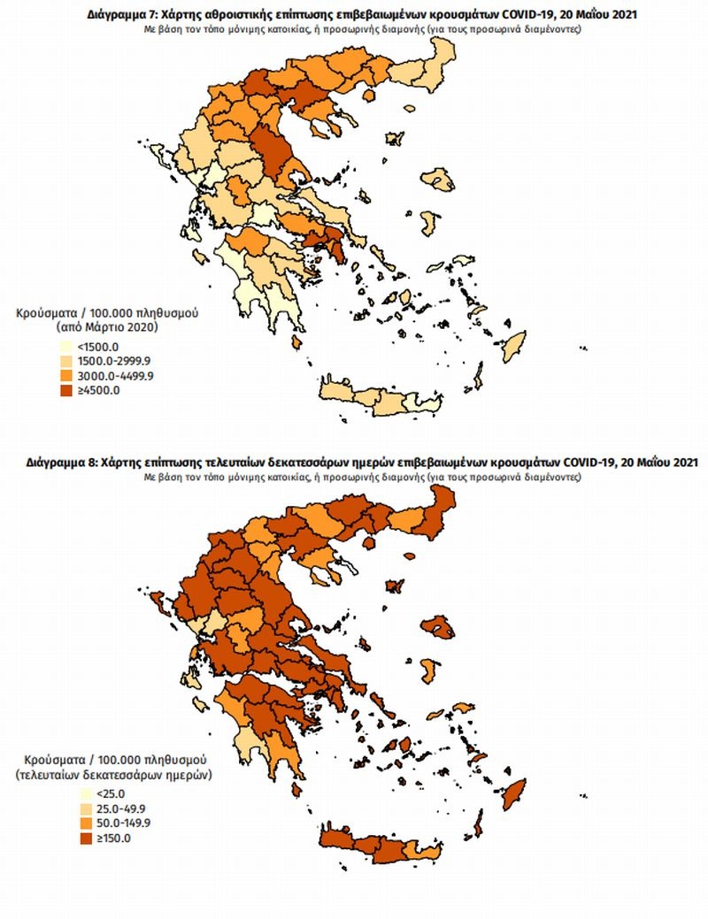 Πίνακας 2: Ημερήσιος αριθμός και κρούσματα ανά 100.000 πληθυσμού επιβεβαιωμένων εγχώριων κρουσμάτων COVID-19 ανά περιφερειακή ενότητα στις 20 Μαΐου 2021