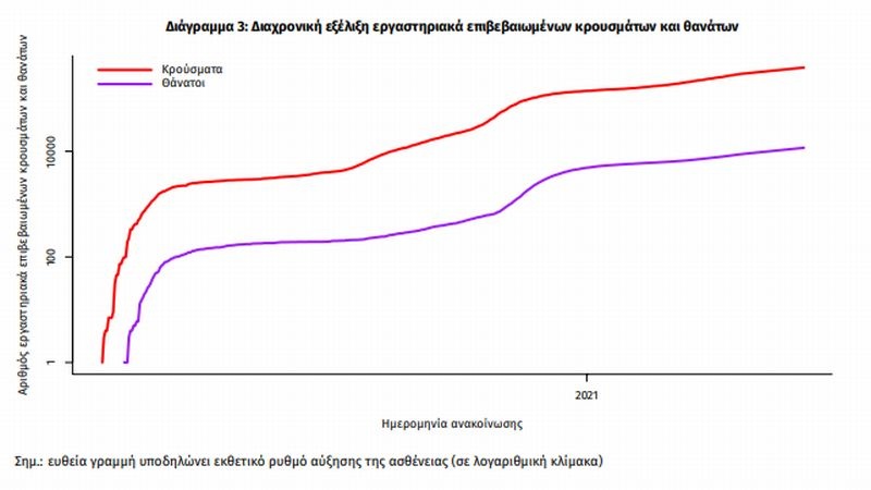 Η διαχρονική εξέλιξη των συνολικών κρουσμάτων και συνολικού αριθμού των θανάτων ασθενών COVID-19 παρουσιάζεται στο ακόλουθο διάγραμμα.