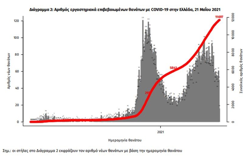 Οι νέοι θάνατοι ασθενών με COVID-19 είναι 56, ενώ από την έναρξη της επιδημίας έχουν καταγραφεί συνολικά 11.697 θάνατοι. Το 95.2% είχε υποκείμενο νόσημα ή/και ηλικία 70 ετών και άνω.